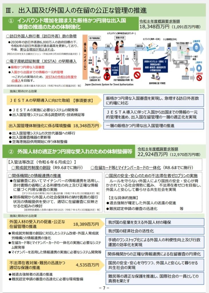 法務省の令和8年度概算要求についてはこちら(https://moj.go.jp/kaikei/bunsho/kaikei02_00150.html)から確認できます。 重点事項として「不法滞在者対策・難民の迅速かつ適切な保護の推進」に45億3500万円。これ以上の詳しいことはここからはよくわかりません。